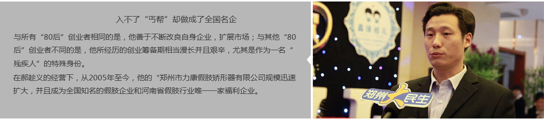 鄭州市力康假肢矯形器有限公司(簡稱力康),是一家專業(yè)從事假肢矯形器的設(shè)計、研發(fā)、制作及裝 配的專業(yè)機構(gòu)。成立于1992年是河南省唯一一家福利企業(yè)。力康下設(shè)業(yè)務(wù)部、技術(shù)部、住院部、康復(fù) 部、售后服務(wù)部,并配有現(xiàn)代化的裝配車間和功能齊全的訓(xùn)練大廳,為殘疾朋友康復(fù)訓(xùn)練提供了可靠 保障。總經(jīng)理穿戴假肢多年,有著豐富的臨床經(jīng)驗和親身體會;多年來,力康已為全國幾十萬名殘疾 朋友安裝上舒適、美觀、耐用的假肢和矯形器具,使他們更大限度地恢復(fù)了正常的工作和生活。“產(chǎn) 品即人品”的質(zhì)量理念、先進(jìn)的技術(shù)、實惠的價格、完善的售后服務(wù)是力康取勝的法寶……
